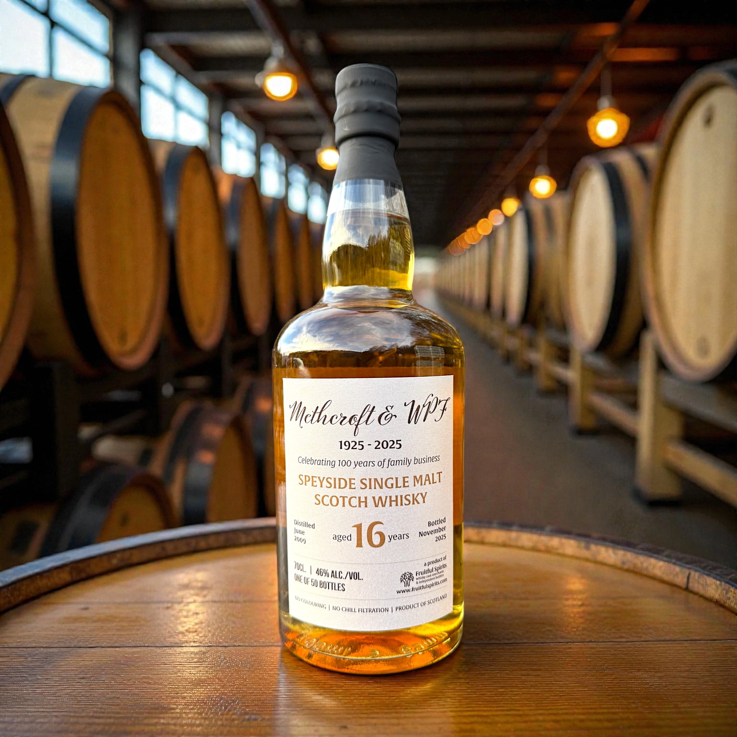 A collaborative bottling was commissioned between two trusted and longstanding partners, Methcroft Ltd & WPJ to celebrate 100 years of family business. A Secret Speyside distilled in June 2009, bottled in November 2025 at 46% ABV, and released with no colouring or chill-filtration. After 12 years in Refill Hogsheads, the whisky was further matured in Bourbon Quarter Casks and a Jamaican Rum Barrel, creating a sweet, rich and fruity spirit of depth and character. Limited to only 50 bottles.