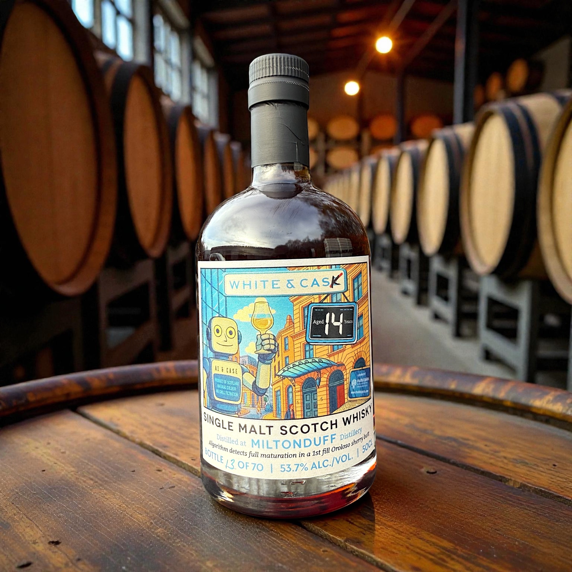 Carefully selected by White & Case as a refined corporate gift for their valued clients. This Miltonduff was distilled in June 2009 and bottled in November 2025 at 53.7% ABV, presented without colouring or chill-filtration. Fully matured for 14 years in a First Fill Oloroso Sherry Butt, resulting in a wonderfully dark and rich whisky. The nose opens with raisins, figs and toffee, leading to a velvety palate of treacle, dark fruits and praline, before a long, warming finish of dark chocolate, spiced oak and orange marmalade. A refined balance of sherry richness and Speyside elegance.
