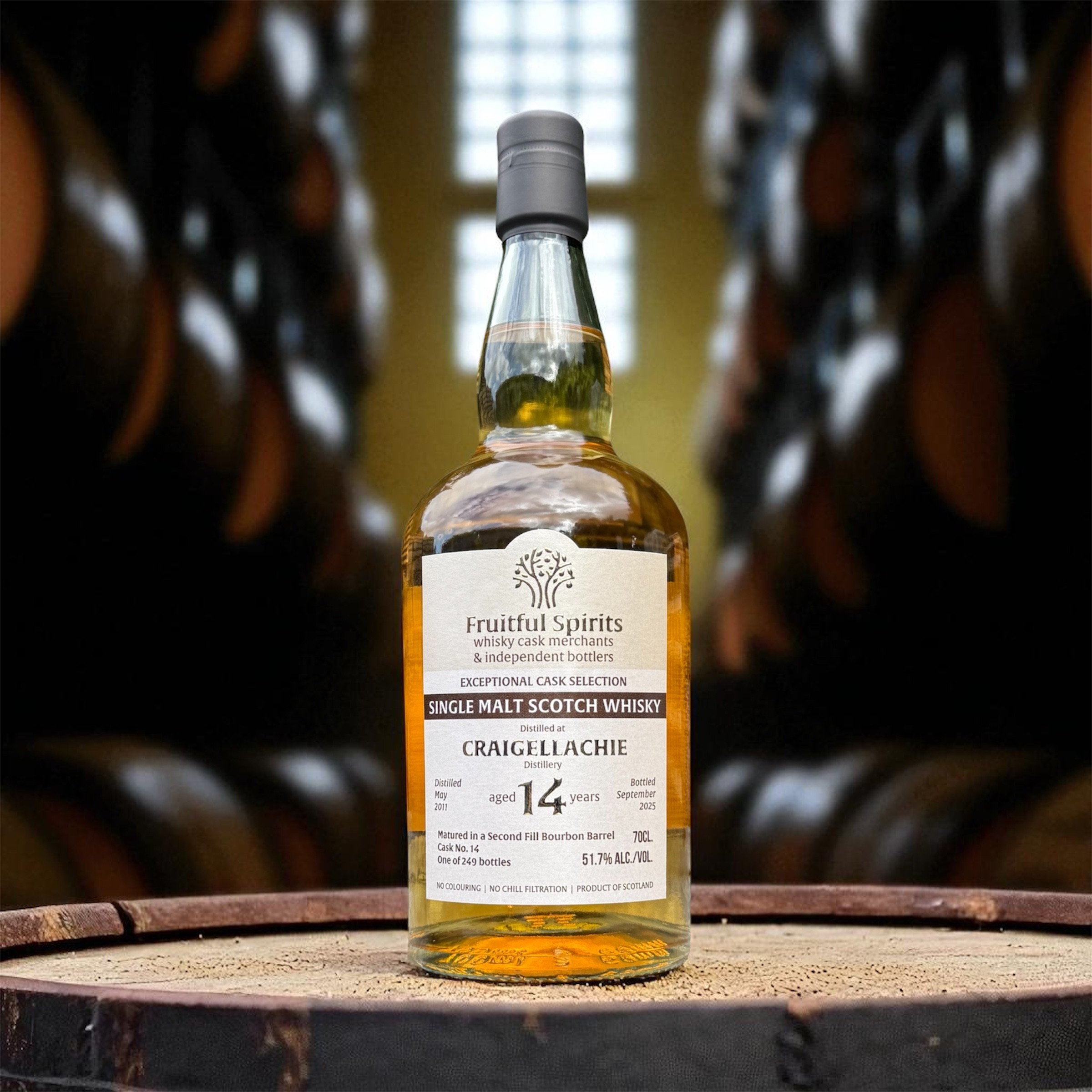 Craigellachie, distilled in 2011 and matured for 14 years in a second fill bourbon barrel. Bottled at cask strength of 51.7%, yielding 249 bottles. Drawn straight from the cask, with no colouring and no chill-filtration. A gentle nose of malt sweetness with ripe banana and orchard fruits leads to a rich palate of honeyed cereal, banana cream, and baked apple, finishing rounded and enduring with mellow fruit and warm malt tones.