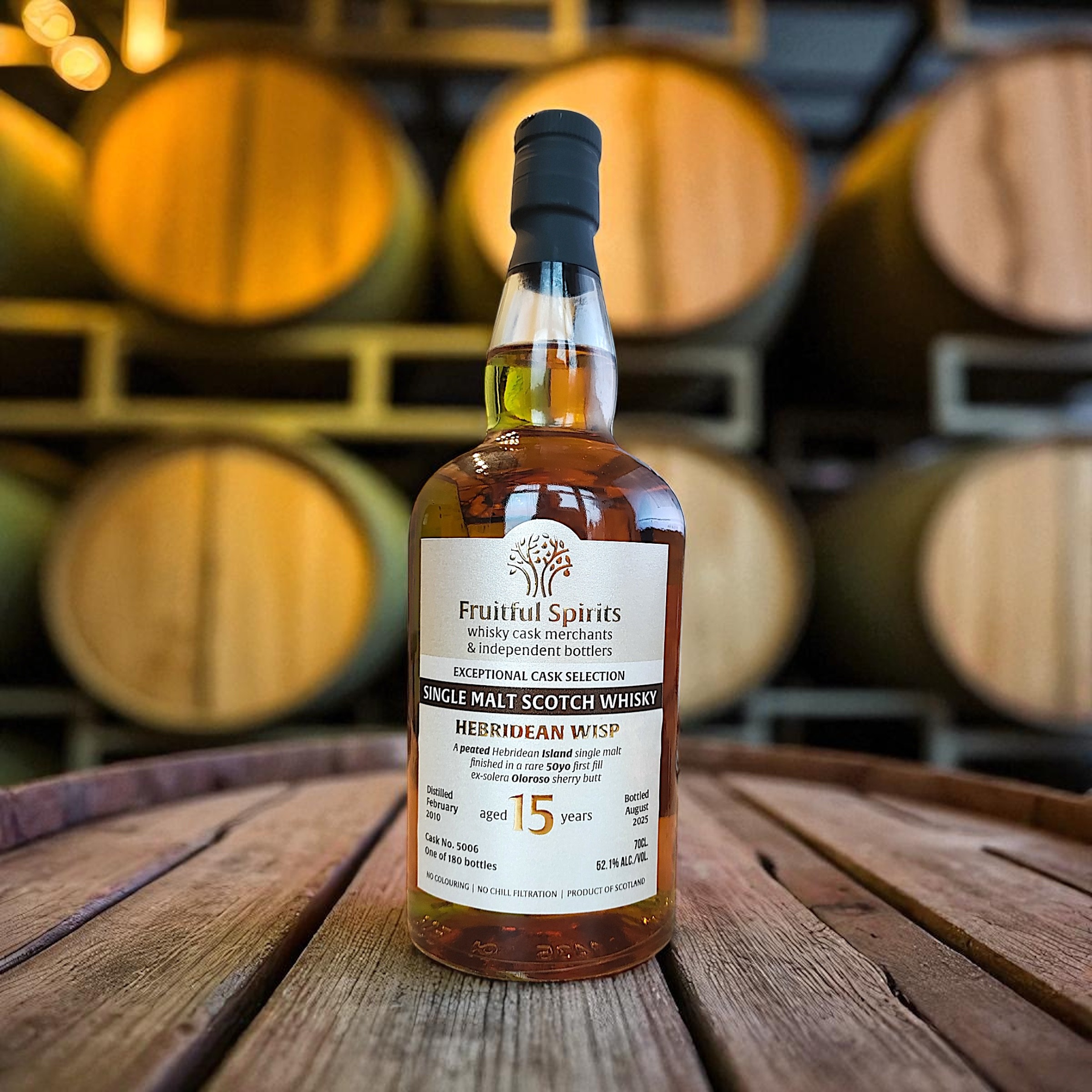 Hebridean Wisp, distilled on 2nd February 2010 and matured for 15 years in a rare First Fill ex-solera Oloroso Sherry Butt of 50 years’ service. Bottled in September 2025 at 52.1%, yielding 180 bottles. Presented without colouring or chill-filtration. The nose opens with coastal salinity and light peat smoke, balanced by sweet raisin and gentle spice. The palate delivers rich dark fruit layered with soft saline peat. The finish is long, with lingering smoke and a touch of oaky dryness.
