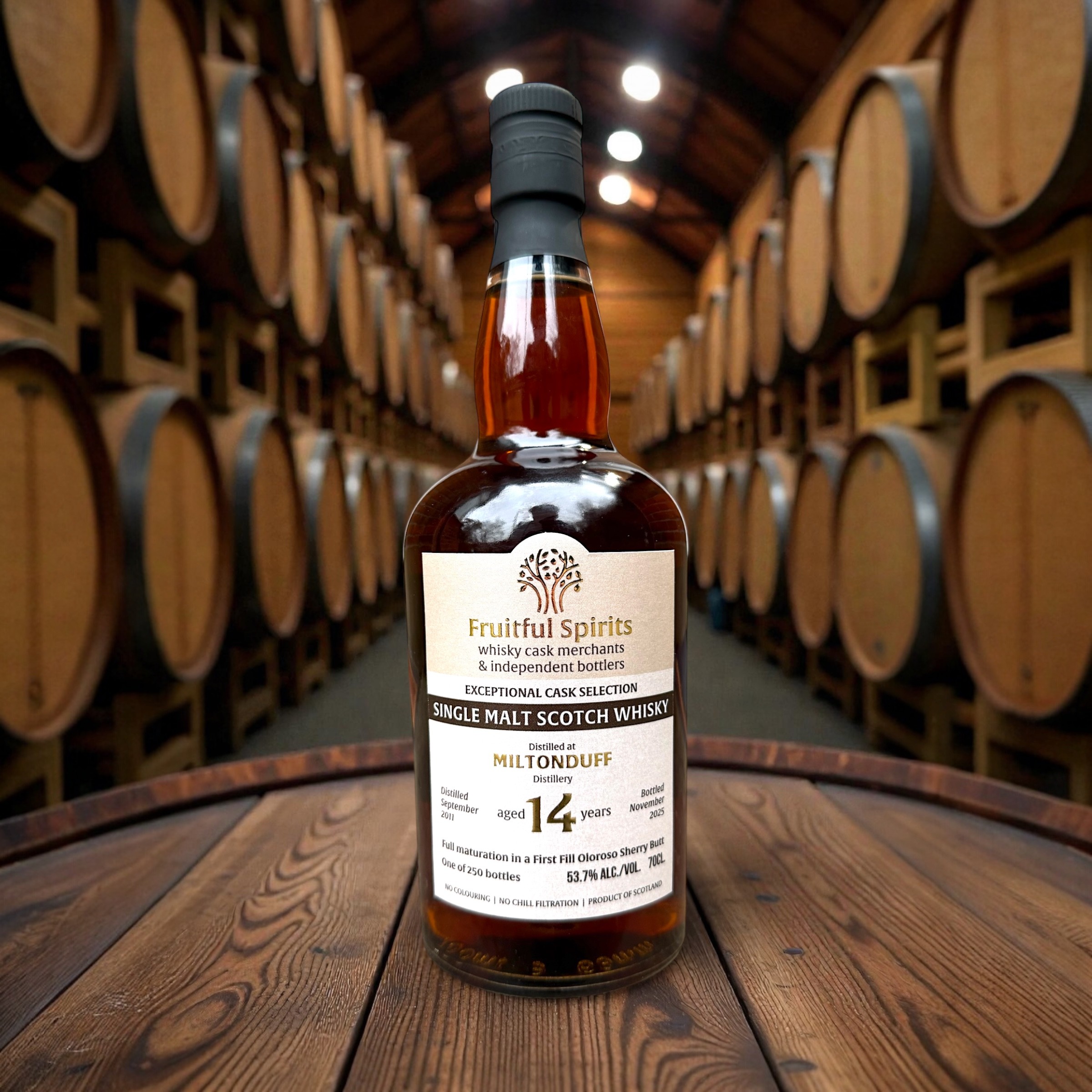 Miltonduff distilled in June 2009 and bottled in November 2025 at 53.7% ABV, yielding 250 bottles. This spirit was fully matured for 14 years in a First Fill Oloroso Sherry Butt, resulting in a wonderfully dark and rich whisky. The nose opens with raisins, figs and toffee, leading to a velvety palate of treacle, dark fruits and praline, before a long, warming finish of dark chocolate, spiced oak and orange marmalade. A refined balance of sherry richness and Speyside elegance.