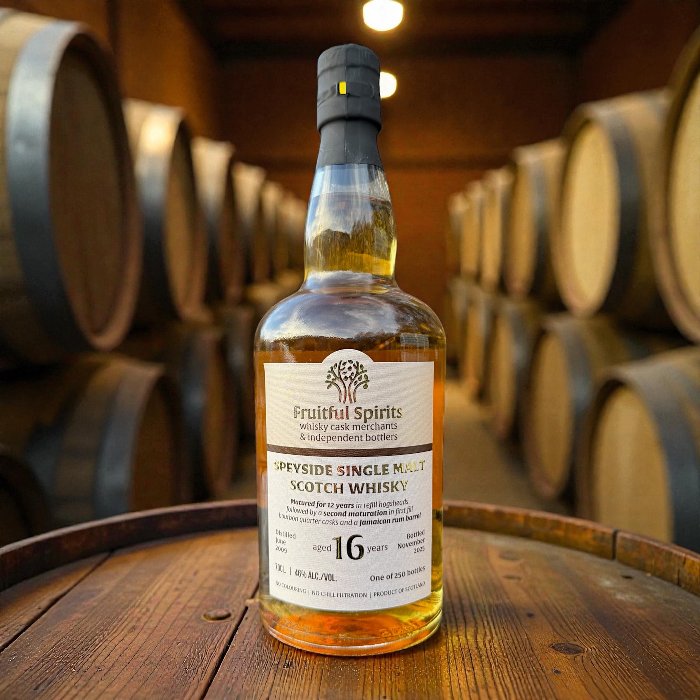 Speyside single malt Scotch distilled in June 2009 and bottled in November 2025, yielding 250 bottles at 46% ABV. This is a sweet, rich and fruity Secret Speyside that has matured for 12 years in Refill Hogsheads, followed by a section maturation in Bourbon Quarter Casks and a Jamaican Rum Barrel. Vanilla and honey lead, layered with orchard fruit and caramelised banana, giving way to a creamy palate of toffee, sweet malt and light citrus, before a balanced finish of tropical fruit, warm spice and soft vanilla.